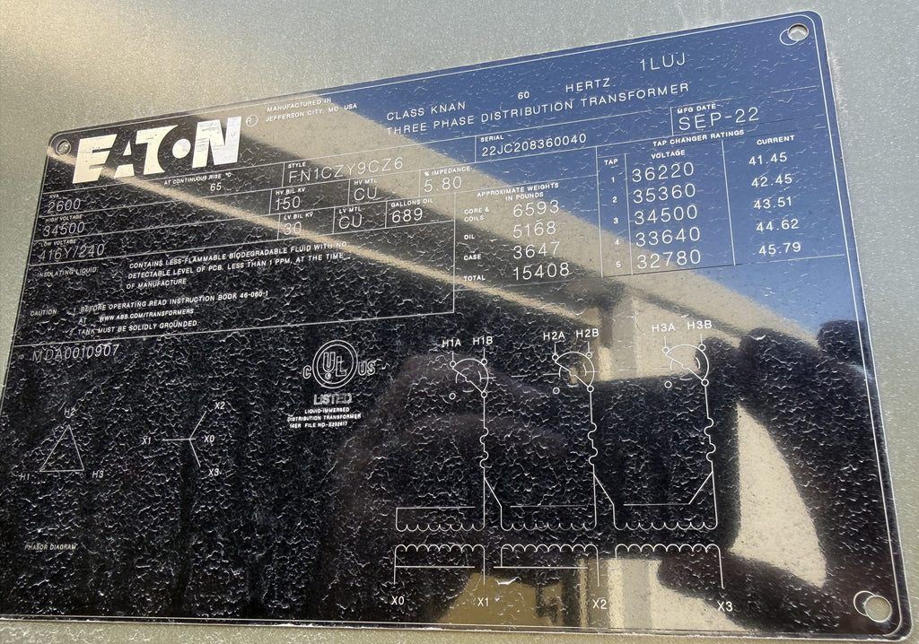 Premium options on name brand Eaton Pad Mounted Three Phase Distribution Transformer: FR3, Copper.