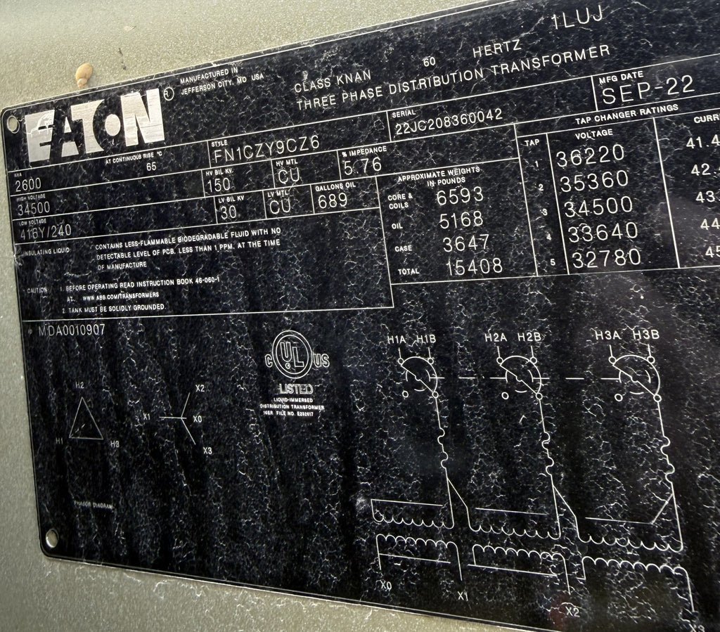 Premium options on name brand Eaton Pad Mounted Three Phase Distribution Transformer: FR3, Copper.