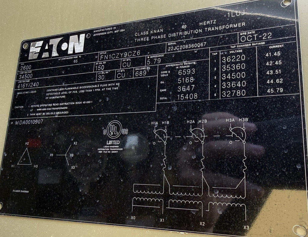 Premium options on name brand Eaton Pad Mounted Three Phase Distribution Transformer: FR3, Copper.